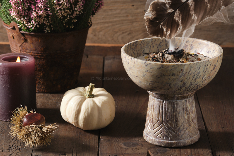 - Räucherwerk: getrocknete Harze, Kräuter, Wurzeln und Hölzer - selbst gemischt (Rezepte s. Abschnitt "Unsere Räucherempfehlungen zu Samhain") oder als fertige Räuchermischungen